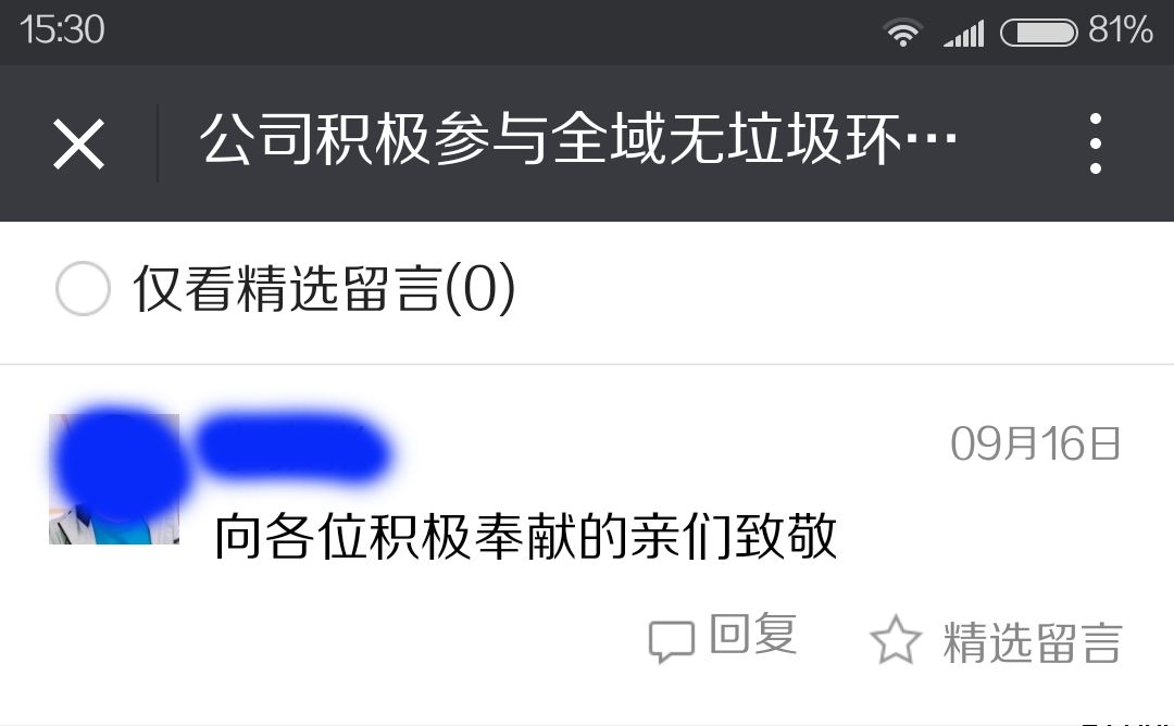 惠民公司全體員工無私貢獻(xiàn),為城市綠色整潔所付出的善行義舉也被社會(huì)各界群眾所稱贊,紛紛點(diǎn)贊支持。有網(wǎng)友在筆者朋友圈留言:“惠民公司處處體現(xiàn)惠民平?jīng)鋈嗣瘛?,還有網(wǎng)友在惠民公司微信公眾號(hào)留言:“向各位積極奉獻(xiàn)的親們致敬”。