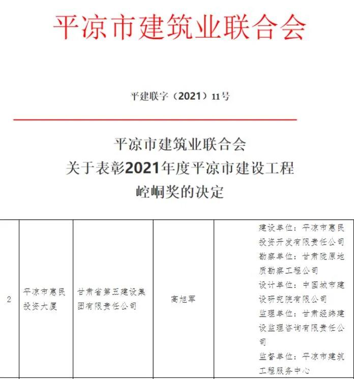 歲末年初,捷報頻傳,在公司上下歡慶惠民公司成立十周年之際,平?jīng)鍪薪ㄖ髽I(yè)聯(lián)合會發(fā)布《關(guān)于表彰2021年度平?jīng)鍪薪ㄔO(shè)工程崆峒獎的決定》,由平?jīng)鍪谢菝裢顿Y開發(fā)有限責(zé)任公司開發(fā)建設(shè),房產(chǎn)公司具體實施的惠民投資大廈項目榮獲2021年度平?jīng)鍪薪ㄔO(shè)工程崆峒獎。