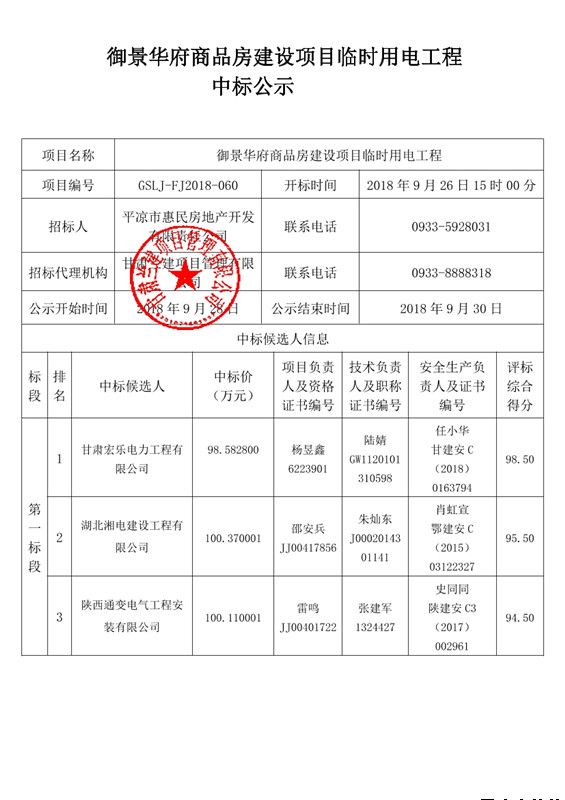 御景華府商品房建設(shè)項(xiàng)目臨時(shí)用電工程中標(biāo)公示