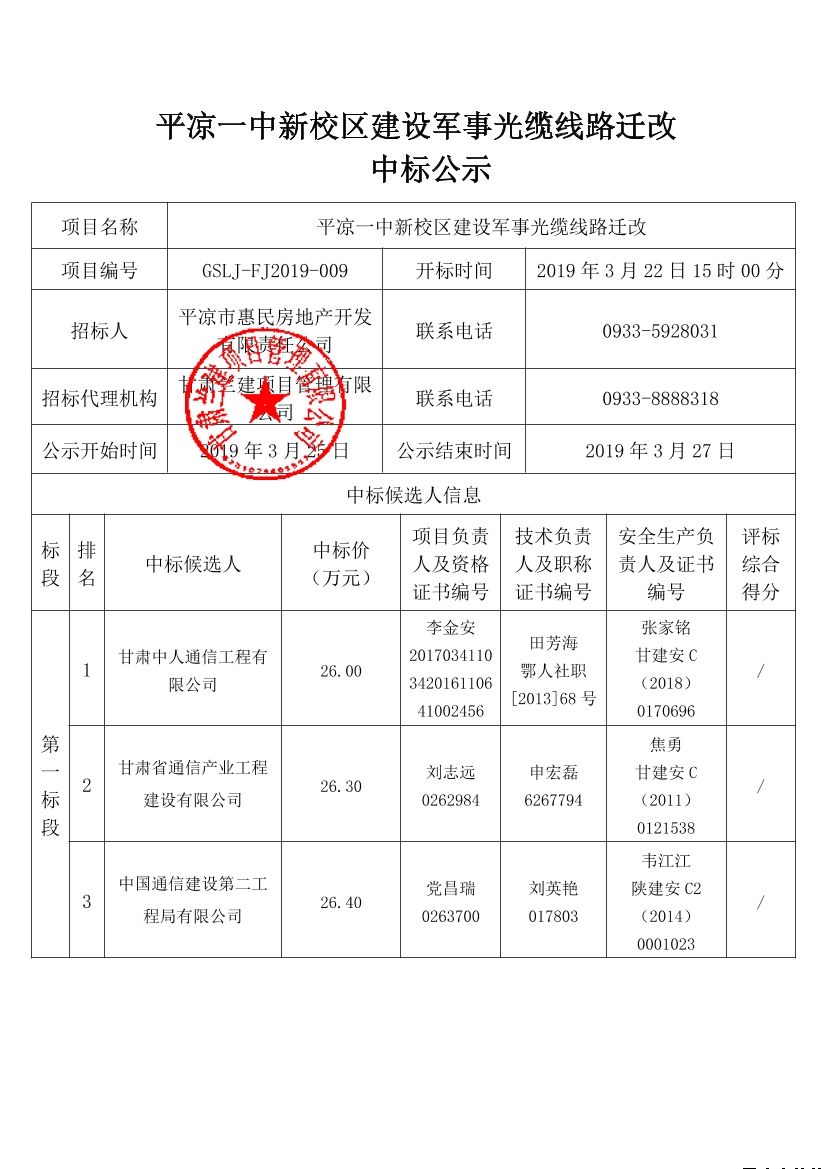 平?jīng)鲆恢行滦^(qū)建設(shè)軍事光纜線路遷改中標公示