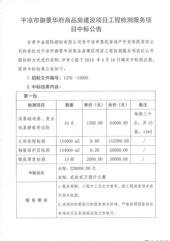 平?jīng)鍪杏叭A府商品房建設(shè)項(xiàng)目工程檢測(cè)服務(wù)項(xiàng)目中標(biāo)公告