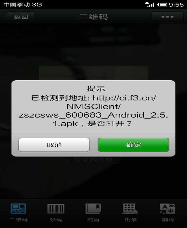 3.成功掃描后,會(huì)出現(xiàn)二維碼內(nèi)容,即APP下載鏈接地址,點(diǎn)擊確定即可跳轉(zhuǎn)到下載界面,點(diǎn)擊下載就能把APP下載到您的手機(jī)了。