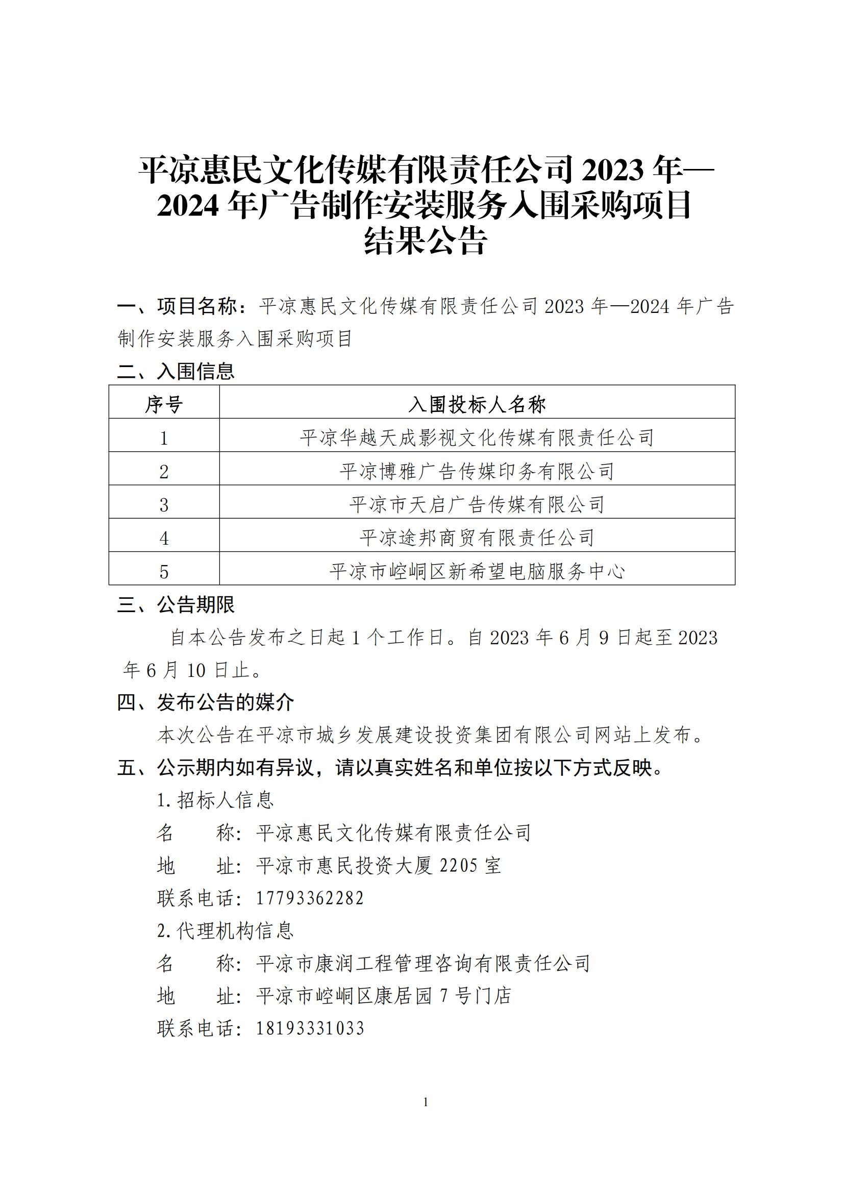 平?jīng)龌菝裎幕瘋髅接邢挢?zé)任公司2023年—2024年廣告制作安裝服務(wù)入圍采購項(xiàng)目結(jié)果公告